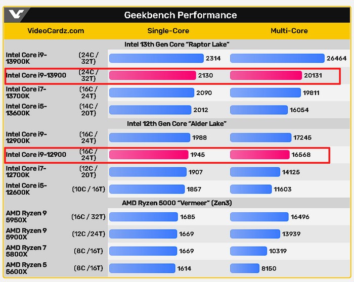 不过VC从其他渠道找到了多组i9-12900+某嘉Z690下的测试成绩,求平均值,最终得出i9-13900的单核超i9-12900大概10%,多核快21%,所以多核成绩变化较大,毕竟多了8个核心。