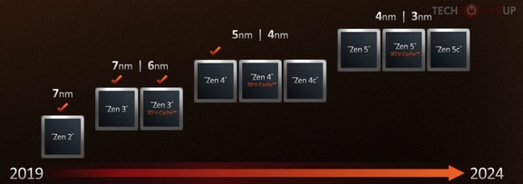 再往后就是全新的Zen 5架构了,和Zen4家族一样也是三个版本,同样也有带3D缓存版本,但是核心工艺会采用4nm和3nm。
