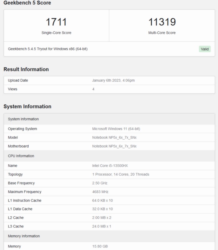 酷睿 i5-13500HX 目前已经出现在 Geekbench 数据中,单核1711,多核11319,作为对比,上代酷睿 i5-12600HX 分别是1700和9235,可见多核性能提升明显。