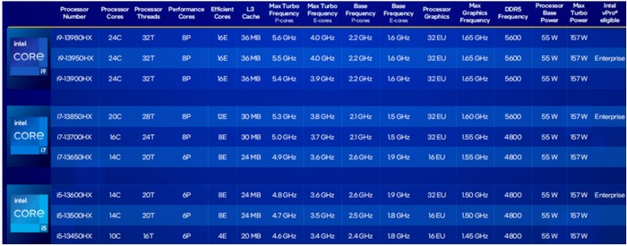 规格方面,酷睿 i5-13500HX为14核心、20线程,包括6个性能核心,8个能效核心,P核心默频2.6GHz,最高可睿频至4.7GHz。另外,它至于55W,不过峰值功耗为157W。另外,它支持4800MHz DDR5 内存,集成16EU单元核显,1.5GHz。