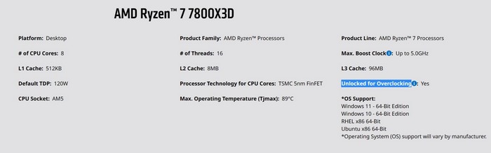 另外,三款功耗都是120W TDP(不是实际最高功耗),都要比非3D缓存的对应版本低(7950X为170W)。另外,官方标注其最高温度为89°C,而7950X 则是95°C。所以猜测三款带3D缓存的新版本预计功耗和温度会对频率影响更敏感。但总好过不能超,用更好的主板和散热器,能更轻松的去榨取性能。