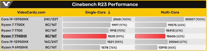 结果显示,这颗锐龙7 7745HX 的跑分成绩很不错,单核1828分,多核18606分。这个成绩比6900HX 单核高15%,多核高34%,即使是对比对比英特尔上代i9-12950HX,单核小胜,多核有差距。