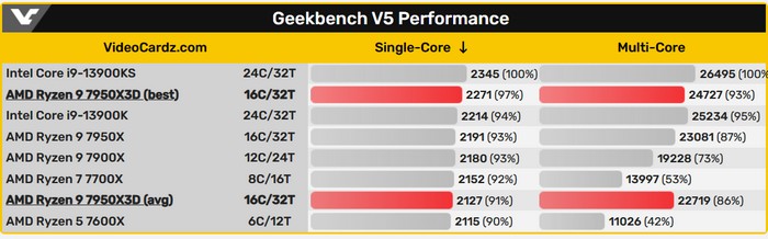 在 Geekbench 5 跑分库中,已经有6个 AMD 锐龙9 7950X3D 跑分成绩,最好成绩是单核2271、多核24727,比没有带 3D 缓存的版本高一些,分别提升4%和7%。由于是测试版,而且不能超频,所以平均的成绩反而并不好,还低于标准版7950X,这个可以忽略。