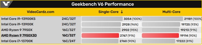 另外,在新版 Geekbench 6 中的另一颗 7950X3D 加速频率为5730 MHz,比标准版5.7GHz略高一些,搭配的是 DDR5-6000MHz 内存。这套方案下,它的单核为2767分,多核19114分,单核比7950X略低,但多核打平。