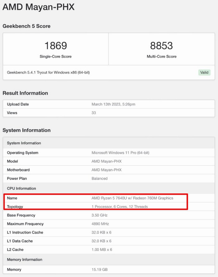 具体到跑分上,CPU单核为1869,多核8863,这个成绩比现有 AMD Ryzen 5 6600U 高出 26% 和 17.6%。