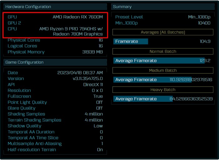 锐龙 9 PRO 7940HS 为 8核心/16线程,主频规格未知,集成了RDNA3核心架构R780M核显,35W-54W TDP。值得一提的是,虽然这次核显很强,但锐龙 9 PRO 7940HS毕竟定位旗舰级,所以测试样机还是搭载了一块独显,型号是从未见过的Radeon RX 7600M 。