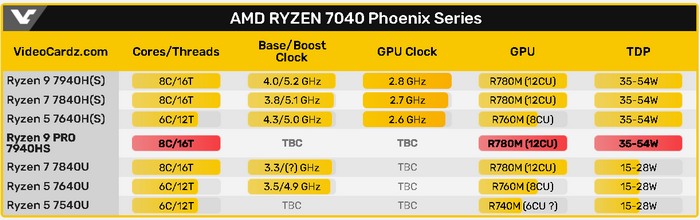 锐龙 9 PRO 7940HS 是目前知道的第十款新 Ryzen APU处理器,大概率是在锐龙9 7940HS基础上优化,增加安全等特殊功能,针对商用本或工作站,下面是VC整理的规格: