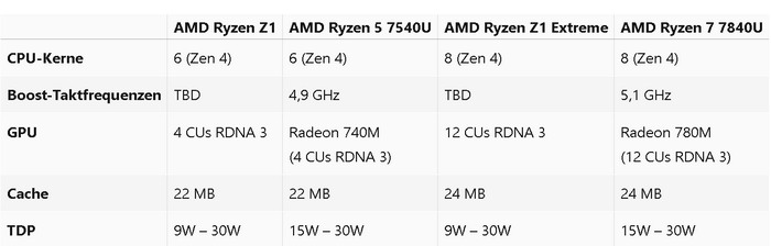除了目前还不确定最高加速频率、以及核显叫法不同外,主要规格都完全相同,最明显的不同是TDP范围。我们看到,Ryzen Z1和Ryzen Z1 Extreme都是9W-30W,而锐龙5 7540U和锐龙 7 7840U都是15W-30W。