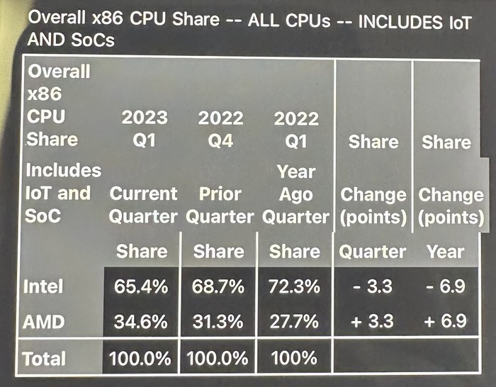 如图,今年Q1季度市场份额同比去年提升了6.9%,从27.7%上升至34.6%,而英特尔从72.3%降至65.4%,不过英特尔仍是市场的主导者,占比约2/3左右。需要说明的是,这份数据是指所有X86 CPU,包括服务器市场。