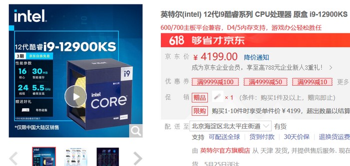 目前酷睿i9-12900KS国内还有售,比上市之初的价格要低许多,但国内仍要3599-4199元,而国外这货早就跌至只要399.99美元(约2800元)了,比发布时的价格(739美元,约5200元)低得多。