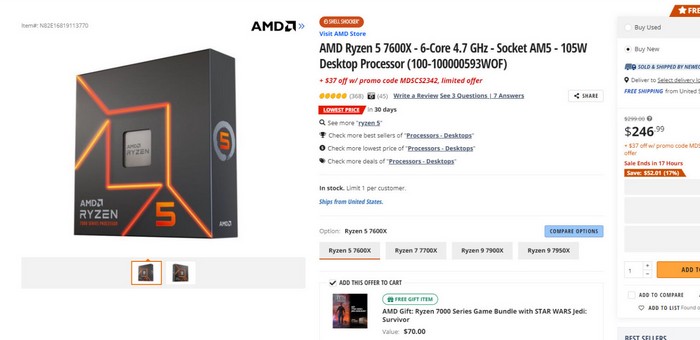 从美亚、新蛋等国外大平台行情来看,最近一周的新锐龙处理器价格又跌了,算上各种促销打折,最终AMD Ryzen 5 7600X 的价格已经跌至209美元(约1480元),比原价低了差不多220元。