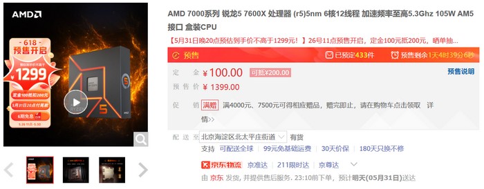 正值6.18大促,国内的价格更诱人。目前 AMD 官方自营店现在只要1399元,算上100元优惠,最低做到了1299元(这里)。对于一款6核心/12线程,而且还是全新Zen 4 架构的主流级处理器而言,这个价格给的相当有诚意。
