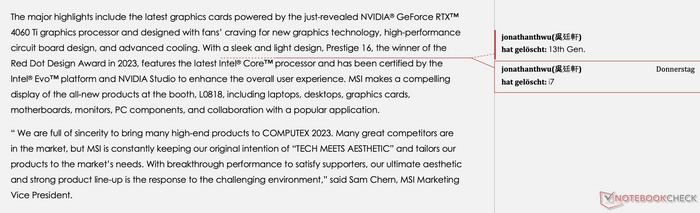 目前不确定型号,但在内部新闻稿中修改删除了“13th Gen”字样,再结合之前的爆料,可能会叫 Core Ultra 7 1003H,酷睿Ultra!