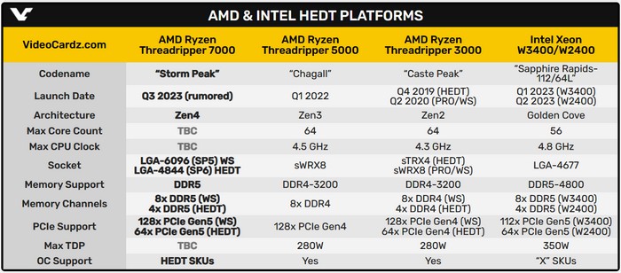 还有一个关键信息,就是针脚。之前有人说这代是SP6,还有说是继续用SP5,现在来看都对,因为X后缀版本用新的SP6(LGA6096),而 WX 后缀继续用 SP5 插槽(LGA4844)。另外,内存和PCIe通道支持也不同,VC整理了对比现款( Threadripper 5000系列)规格: