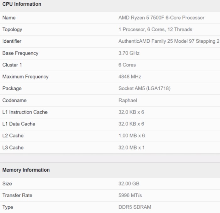 之前的传闻是真的,AMD 确实还有锐龙5 7500F,不带核显,目前该处理器已经出现在GB跑分库,性能还不错。