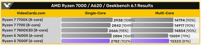 这个成绩比7600X 单核低大概3.7%左右,但多核高了2%。这点差异可以忽略,因此,锐龙5 7500F存在的价值,应该是价格,虽然目前还没有公布价格,应该会略便宜些,必须得搭独显使用。