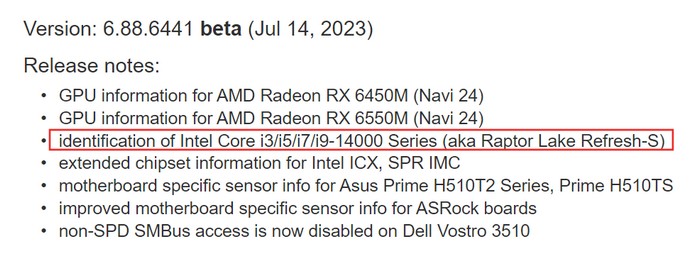 重点是对英特尔CPU的支持,我们看到了 Raptor Lake R,也称为第14代酷睿S(14xxx系列)桌面级的支持,还特别标注了酷睿i3/i5/i7和i9前缀,这意味着第14代还是延续多年来的命名方式,而移动版第14代已经要变成酷睿 Ultra xx 了。