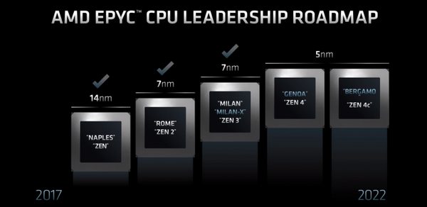 第四代 EPYC 包括 Genoa 和 Bergamo 两个系列,前者最高 96 核 / 192 线程、后者最高 128 核 / 256 线程。