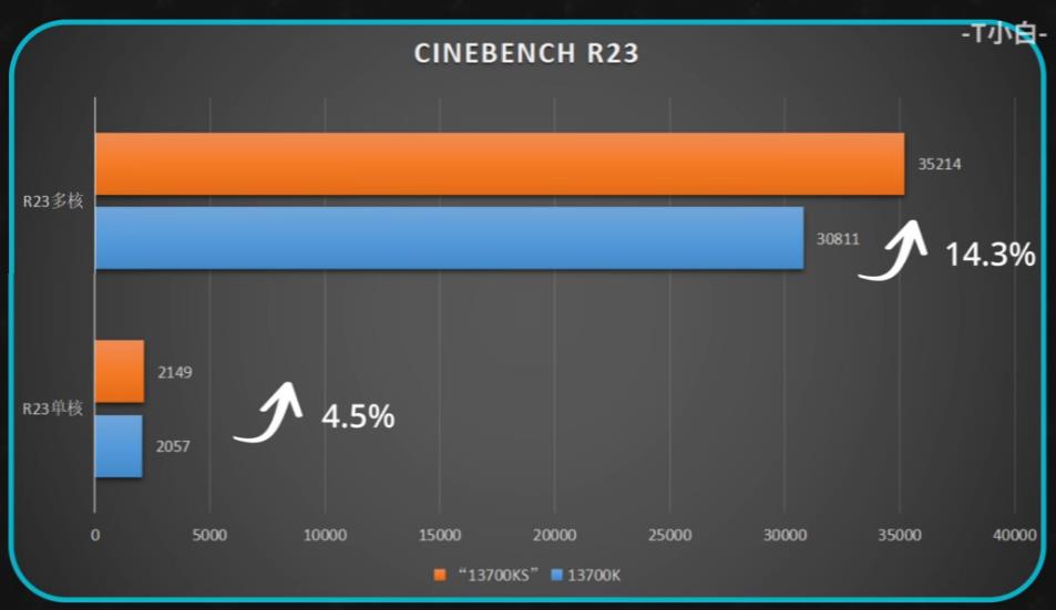 据外媒 VC 援引 B站“T小白”消息,该UP主已对还未上市的酷睿i7-14700K进行了测试,并拿上代 i7-13700K 对比。结果显示,多核性能提升较明显,单核不大。