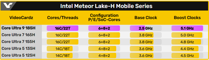 以下是VC 统计的即将登场的酷睿Ultra 系列的五款处理器部分规格,预计酷睿 Ultra 7 155H 会是装备最多的型号,但预计酷睿Ultra 5 125H 的游戏本最有性价比,可能会配合 RTX 4060/4070等显卡。