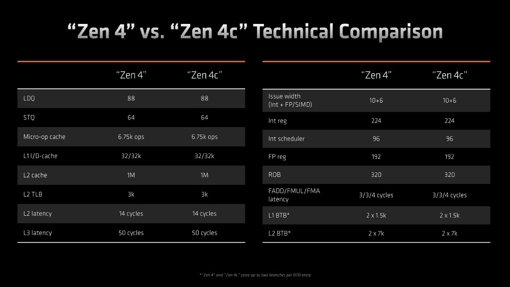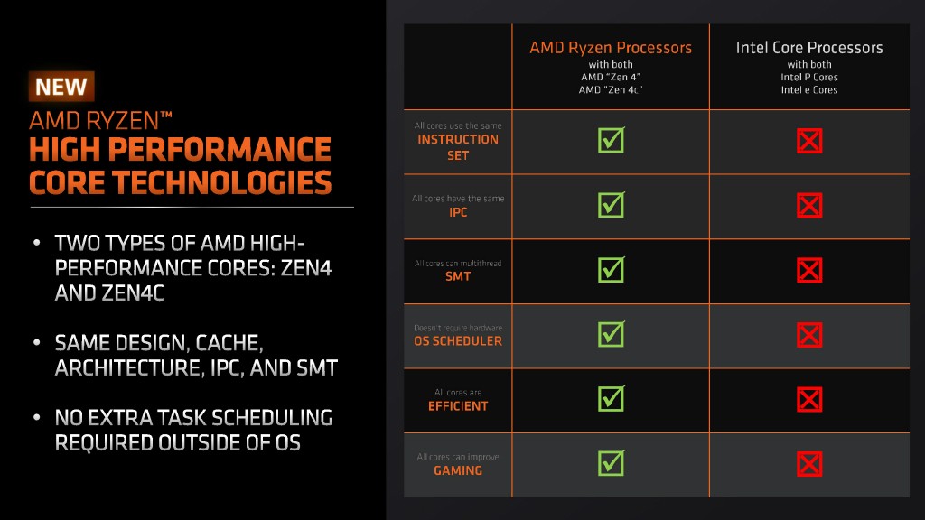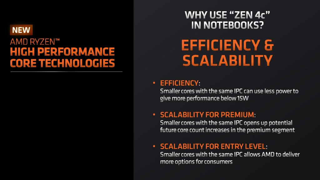 先来了解下混合架构。AMD 表示,Zen4c小核的加入核心面积缩小 35%左右。另外,能效表现更好,但不同于英特尔的做法,Zen 4C 和 Zen 4 使用相同的 ISA 并具有相同的IPC,但即使是小核 Zen 4C 也仍然支持SMT超线程技术,这意味着相较英特尔的能效核有着更好的性能表现。特别值得一说的是,这种小核心的加入,在低负载时的能效表现会更好,20W以下的能效表现更优异。
