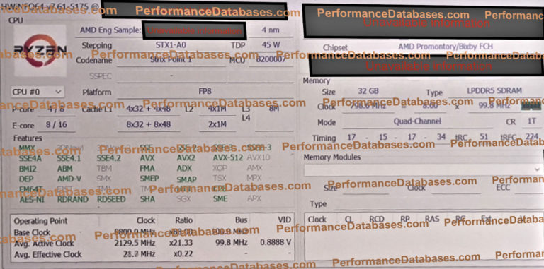 如图,HWINFO 工具截图显示,这是一颗12核心,24线程新锐龙,采用大小核混合架构,有4个P大核心/8线程,8个E能效小核心/16线程,4nm工艺,45W TDP,FP8封装,注意核心代号,STX1-A0,也就是核心代号为“Strix Point”的 Ryzen 8000 系列锐龙移动版处理器。从TDP来看,这应该是一颗H(S)标压版本。