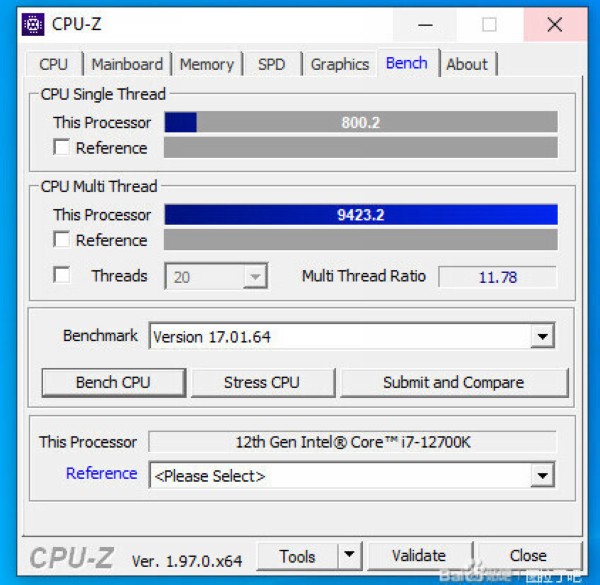 据爆料一向很准的@TUM_APISAK推特消息,酷睿i7-12700K已经完成测试,在CPU-Z的性能成绩也非常亮眼,单核达到了800.2分,而多核更是达到了9423.2分,这个成绩相当可观,多核性能甚至和AMD Ryzen 9 5900X相当。尽管单核性能弱于大哥i9-12900K,但已经相当不易。
