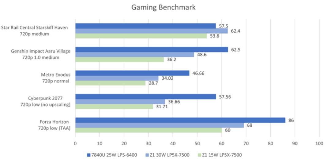 所以,Z1天生就是为了相对轻量的游戏而生的。而Z1E和7840U在25W下依然处于喂不饱的状态。