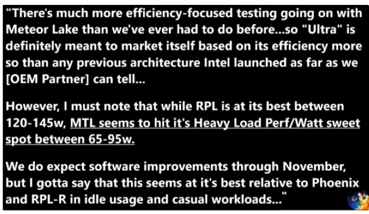“摩死”还公布了酷睿 Ultra H 系列的功耗细节,确认功耗在 65W-95W 之间,要比上一代Raptor Lake H更省电(120W-145W 左右)。