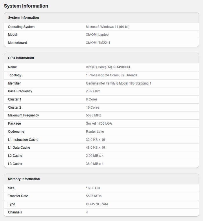 小米方面,一款内部型号为 TM2211 的笔记本出现在 GB 跑分库中,可能是 Redmi G 系列游戏本,搭载第14代酷睿 i9-14900HX 和酷睿 i5-14500HX ,核心配置和性能公开。