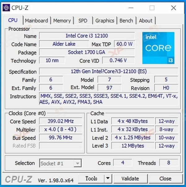 英特尔第12代酷睿“非-K”版将于明年年初发布,目前有更多消息曝光,是一颗入门级的i3-12100,其CPU-Z、性能跑分都已经出炉,赶紧来瞧瞧。