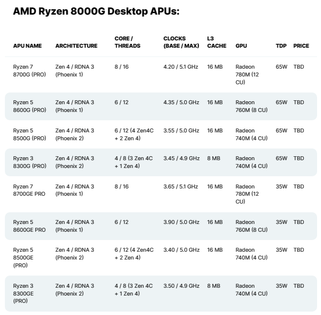 据了解,新一代有 Ryzen 7 8700G(Pro)、Ryzen 5 8600G(Pro)、Ryzen 5 8500G(Pro)、Ryzen 3 8300G(Pro),以及专业版Ryzen 7 8700GE Pro、 Ryzen 5 Pro 8600GE Pro、8500GE Pro、Ryzen 3 Pro 8300GE Pro 等,核心配置和默频/加速频率等规格 WCCF 整理如下: