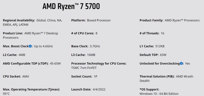 前不久业内传出,AMD 不计划放弃老锐龙,接下来会继续更新产品线。现在,AMD 官网悄悄的上架了一颗 Ryzen 7 5700 处理器,注意后缀没有“X”和“G”,时隔三年多,Ryzen 5000 系列再次更新。