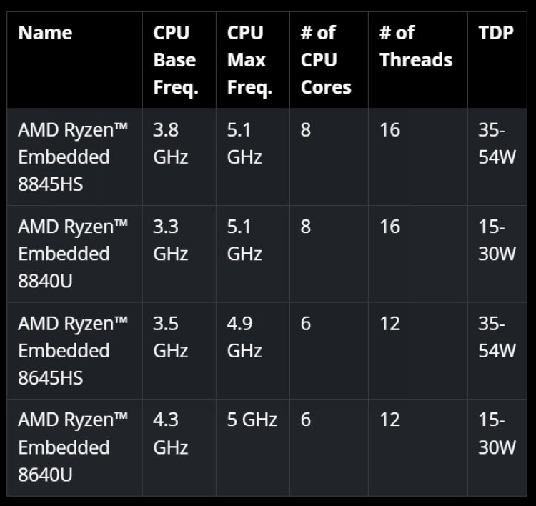首发有 Ryzen Embedded 8845HS、8645HS、8840U 、8640U 四款,两款标压、两款低压,都采用 Zen 4 架构,4nm 工艺,最高8核心/16线程,TDP维持在15-54W之间;集成 XDNA 架构 NPU单元,算力39TOPS,适用于要求苛刻的多样化工业计算工作负载。此外,还集成RDNA 3 架构核显,可以支持4路4K外接,支持 AV1、H.264 和 H.265 等解码编码,具体规格如下: