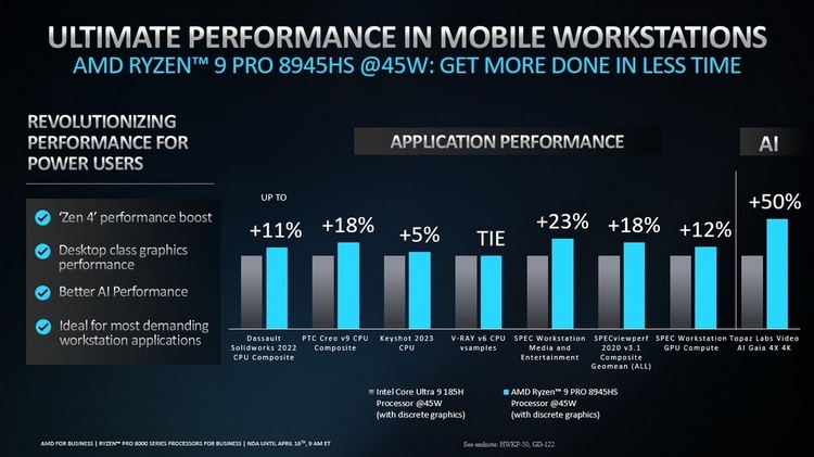 官方列举了 Ryzen 9 PRO 8945HS 和酷睿Ultra 9 185H 的性能对比,在应用性能方面比它高出23%,AI 性能快50%。 此外,低压系列 Ryzen 7 PRO 8840U 在性能上也超过了英特尔的 H 系列,与同级别的酷睿 Ultra 7 155H 相比,使用AI的人脸识别和视频识别等性能高79%,图像转录和视频处理性能高85%。