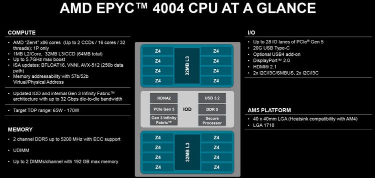 EPYC 4004 系列基于全新 Zen 4 架构核心,采用 Socket AM5 针脚,最高拥有16个核心、支持双通道DDR5内存(支持ECC,最高192GB 5200MHz)和28条PCIe Gen 5 通道,相关工作站可以带来不错的性能、安全性和能效表现。