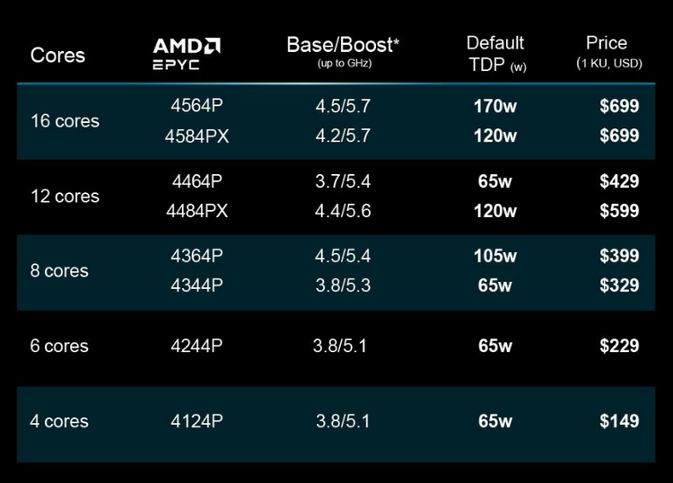 最低是4124P,只有4核心,默频和加速频率都不低,最高可达5.1GHz,仅65W,重点是价格仅149美元(约1070元);最高是4564P和4584PX,两款都是16核心,默频不同,加速频率都是5.7GHz,功耗不同,最高是170W,价格相同都是699美元(约5060元);定位中端可能是最走量的4364P和4344P 都是8核心,最低只要329美元(约2380元),用来打造入门级工作站再适合不过了。