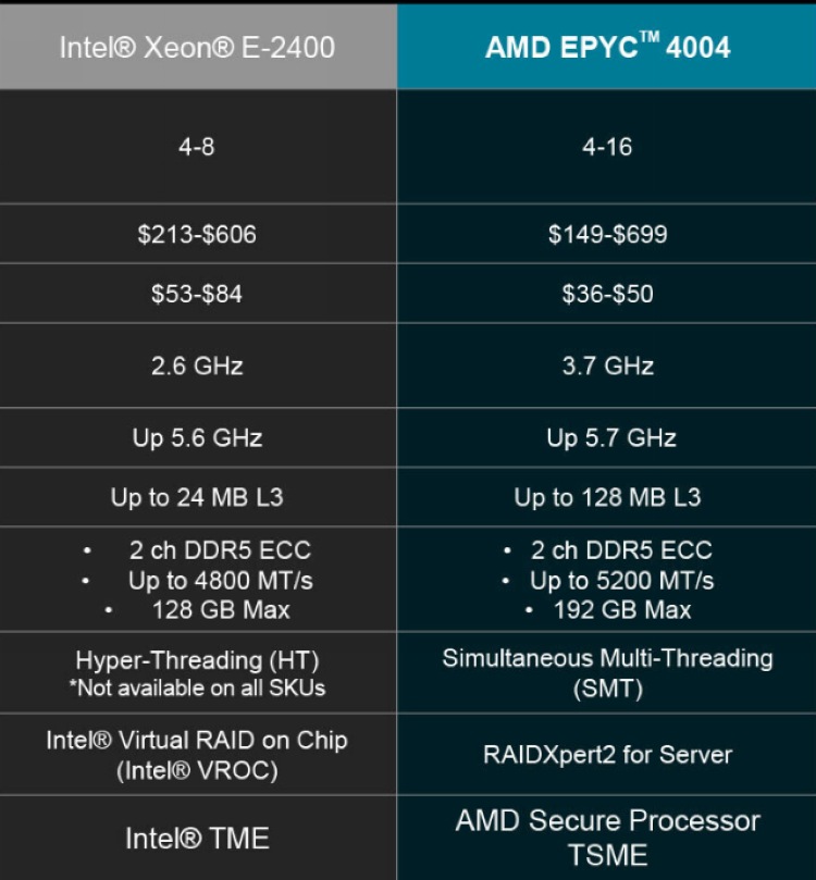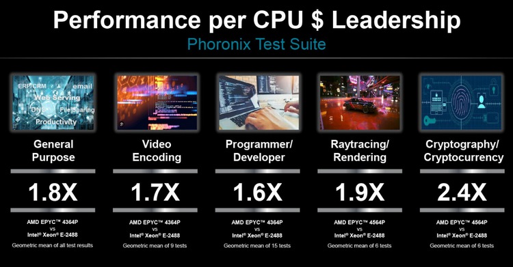 至于性能,AMD拿4004系列来对比 Xeon E-2400 系列,在几项服务器测试项目中优势明显,如下: