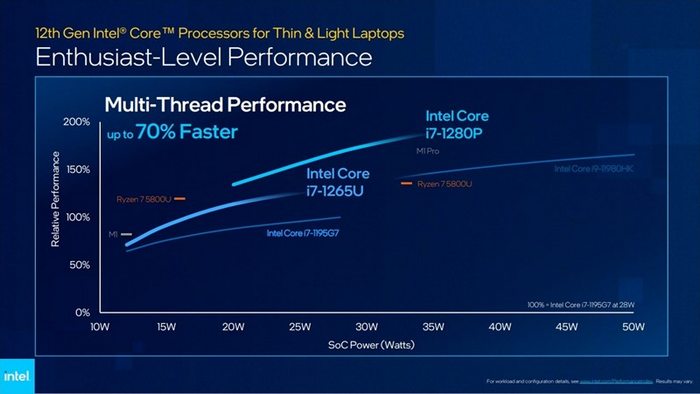 至于性能,官方宣称比上代的多线程性能最多提升70%,3D渲染提升了接近两倍,而照片编辑速度提升最高也有30%,生产力较上一代产品来说有了相当大的提升。以Core i7-1195G7在28W时的性能表现为100%的参照点,这代的Core i7-1265U大约用了17或18W的功耗就能提供相近的性能,而Core i7-1280P在同样的功耗下性能提升了相当多。