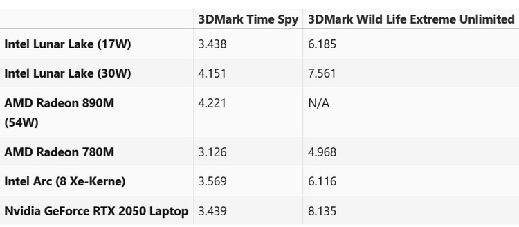 测试竞品有 AMD 新锐龙 Ryzen AI 9 HX 370的 Radeon 890M 核显,上一代旗舰芯片的 Radeon 780M 核显,还有笔记本 RTX 2050 以及锐炫 Arc(8核心),新酷睿 Ultra 200V 系列型号没说,有17W和30W两种性能模式下,分别测试3DMark Time Spy 和 3DMark Wild Life Extreme Unlimited,测试结果如下: