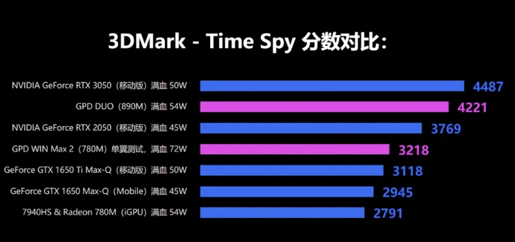 我们看到,在3DMark Time Spy 测试中常规模式下分数超 Radeon 780M核显,30W满血性能模式下虽然不如890M(可比肩RTX 3050),但考虑到功耗,能效比非常优秀。