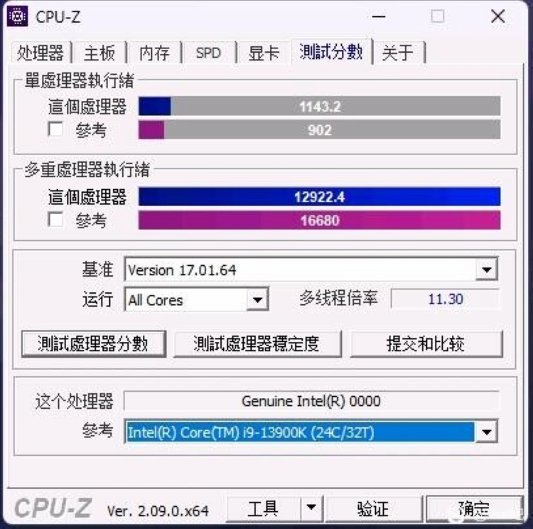 如图,单线程得分1143.2分,跟现有酷睿 i9-13900K 对比(902分),大概高了26.71%,这个成绩相当可以。不过,多线程得分低了约22%。