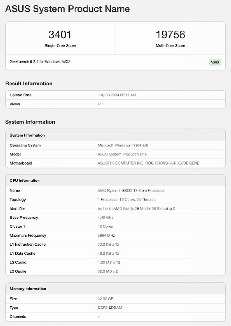 今日,华硕某测试机出现在 GB 跑分库中,搭载了 AMD 还未发布的 Ryzen 9 9900X 处理器。
