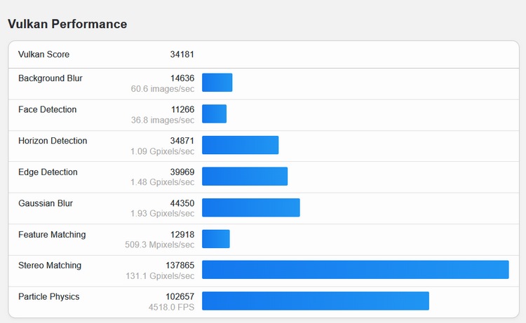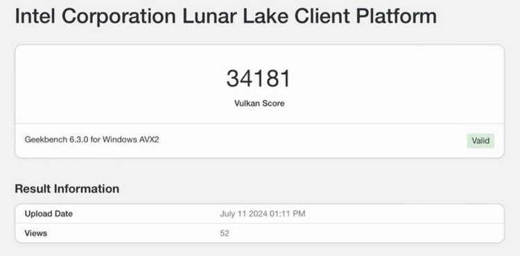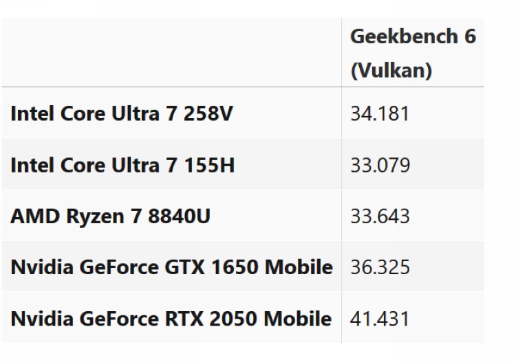 如图,该机搭载的是酷睿 Ultra 7 258V 处理器,包括 8个Xe2 单元核心,1.95GHz 加速频率,Geekbench 6 Vulkan 最终获得34181的分数,这个成绩比酷睿 Ultra 7 155H 和 AMD Radeon 780M 略高一些。再结合之前传闻,这和 3D Mark TS 和3D Mark Wild Life Extreme 的成绩类似,接近 GTX 1650 独显。
