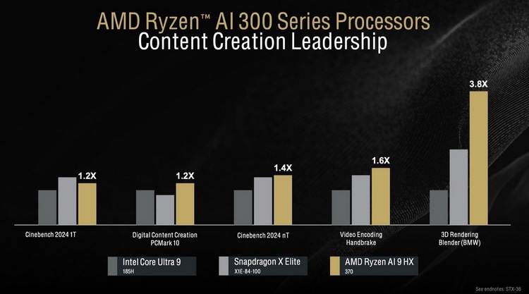 测试拿 Ryzen AI 9 HX 370(华硕 Zenbook S 16)和英特尔酷睿 Ultra 9 185H(华硕 Vivobook S 16)以及高通骁龙 Snapdragon X Elite(三星Galaxy Book4 )进行对比,结果如下:
