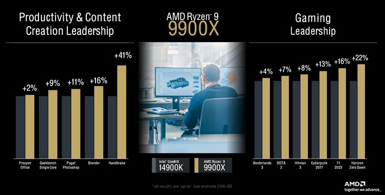至于生产力和游戏中的表现,Ryzen 9 9900X 和酷睿i9-14900K 对比如下:游戏高出4%到22%,Handbrake视频编码速度快41%左右,渲染建模应用Blender中快9%左右。