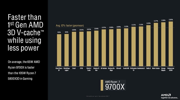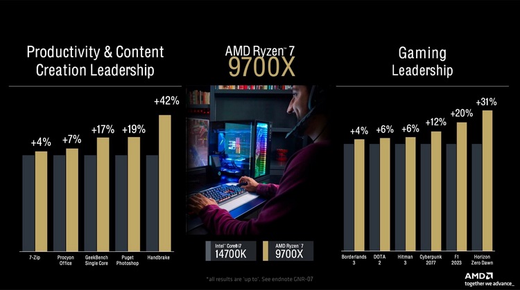 AMD Ryzen 7 9700X 和酷睿 i7-14700K 对比,游戏性能高出4%-31%;而对比自家Ryzen 7 5800X3D平均高出12%,但TDP低了40瓦。