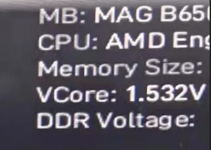 如图,他表示AMD新 Ryzen 7000 系列的某型号,正在微星 MAG B650 主板上测试,BIOS截图显示此时CPU电压为1.5V,可以确定这是颗ES测试版CPU,主频未透露,预计离正式版步进不会太远。