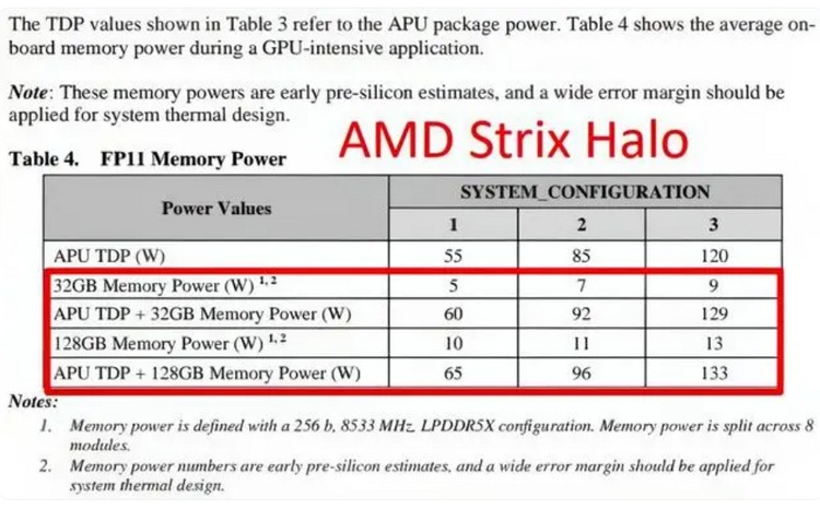 最后,传闻 Stirx Halo APU 将板载史无前例的128GB 超大内存,LPDDR5X-8000频率,内存将和处理器部分整合在一起,注意不是在核心旁边的那种。性能强大,功耗也随之增长至120W…..显然不是普通游戏本定位。
