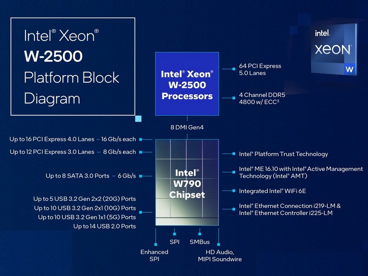 最后,都支持 PCI Express 5.0,Xeon W-3500 系列多达 112 个通道,Xeon W-2500 系列多达 64 个通道。
